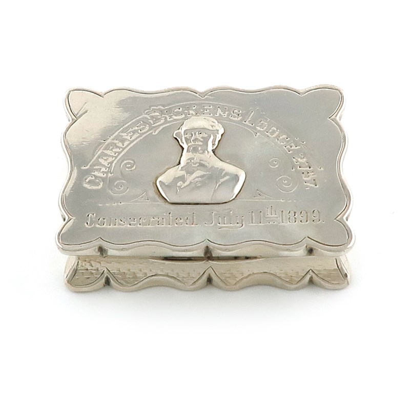 rectangular form, engine-turned sides and base, the hinged cover with a raised portrait of Charles Dickens and inscribed 'Charles Dickens Lodge 2757, consecrated July 11th, 1899', length 6.5cm, approx. weight 2.2oz.