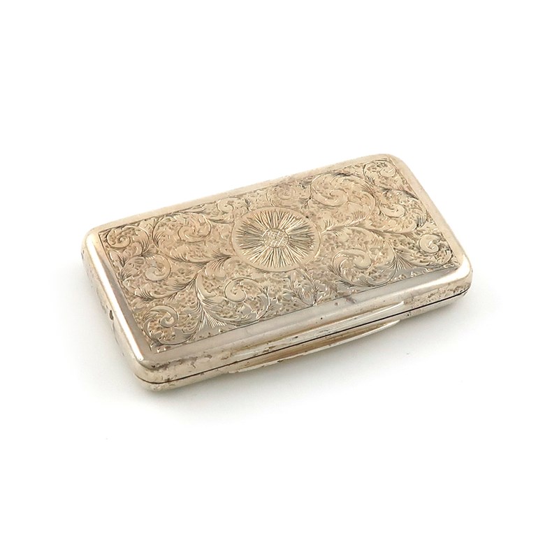 slender rectangular form, the cover with chased foliate decoration, length 8.4cm, approx. weight 2.5oz.