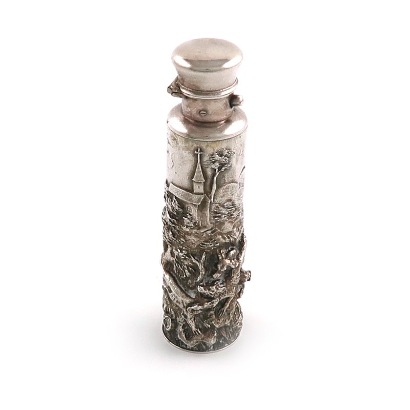 cylindrical form, with a raised scene of hounds chasing a fox, push-button hinged cover, length 8.9cm.