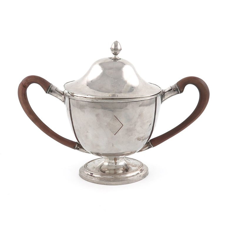 oval form, scroll handles, the base of the handles with hinged covers to the water compartment, the pull-off cover with an acorn finial, the interior with a pull-out two egg holder, engraved with a lozenge, on an oval foot, length handle to handle 27.3cm.
