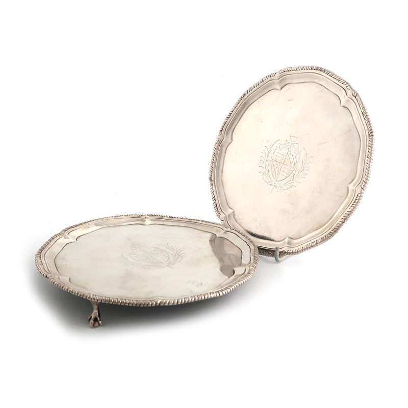 circular form, gadroon borders, the centres with armorial shields within foliate mantling, on three claw and ball feet, diameter 8cm, approx. weight 17,5cm. (2)