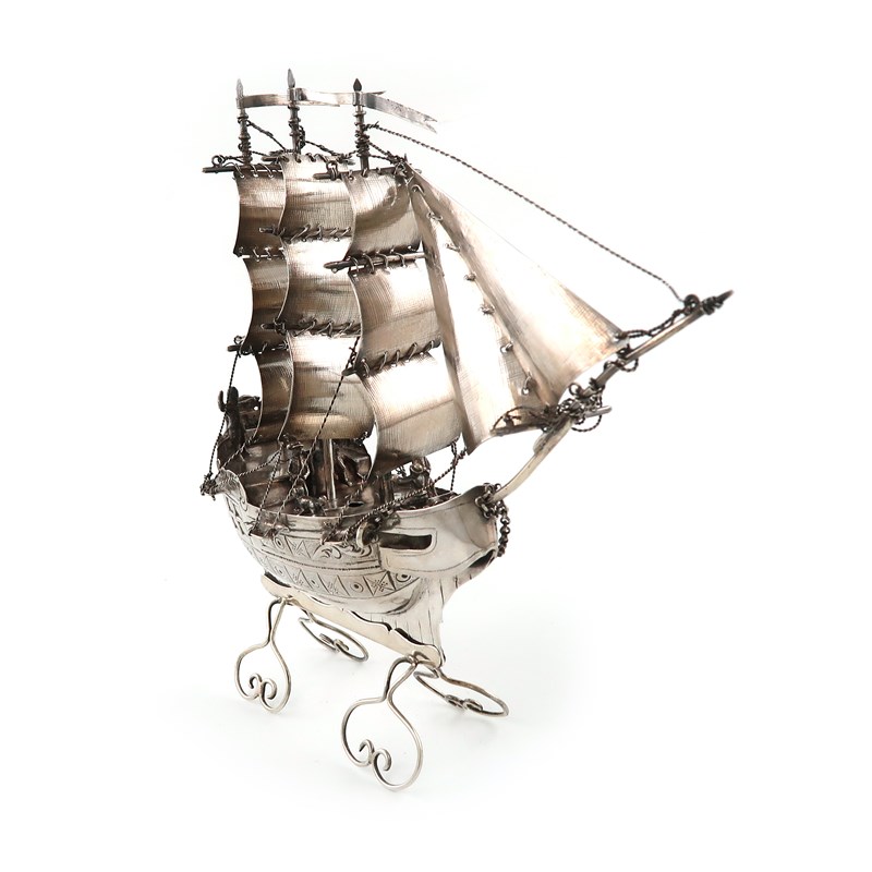 with three masts in full sail, with figures on the deck, on a wire-work scroll stand, height 23cm, approx. weight 11.7oz.