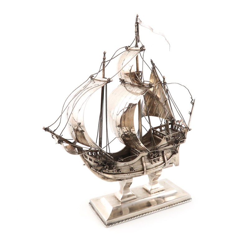 modelled with three masts in full sail, on a rectangular base with a rope-work border, height 24cm, approx. weight 16oz.