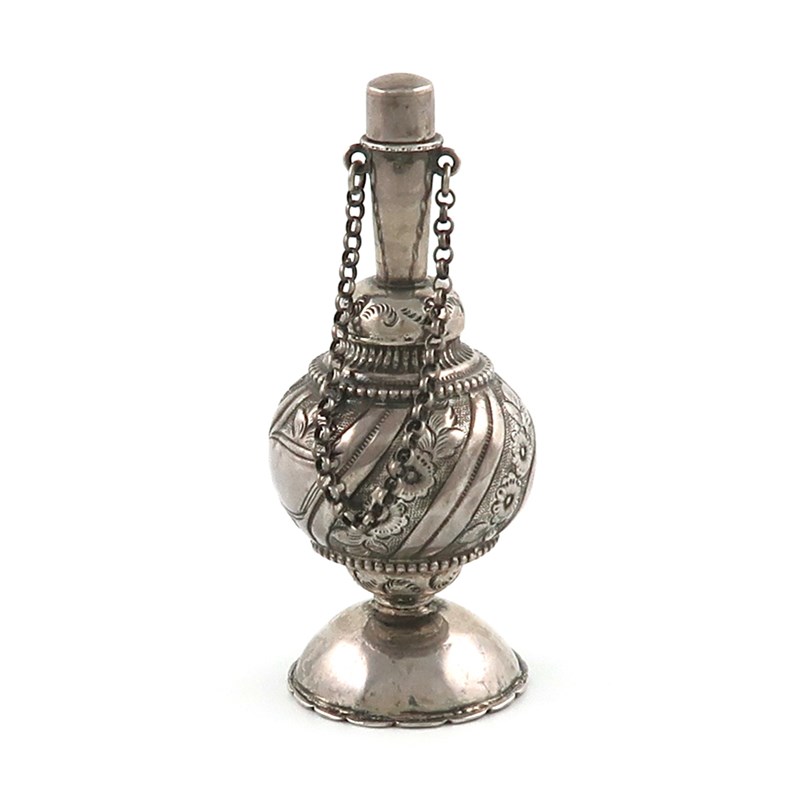 baluster form, swirl fluted and foliate decoration, pull-out stopper with a chain, on a raised circular foot, height 7.7cm, approx. weight 0.6oz.