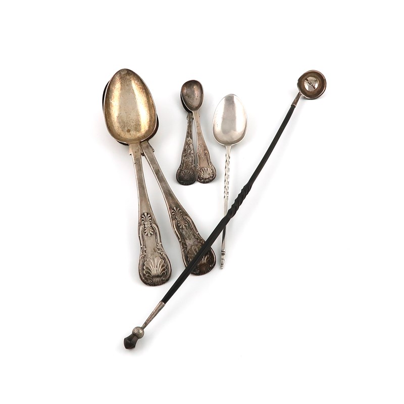 comprising: a Scottish provincial silver toddy ladle, by Ferguson and MacBean, Inverness circa 1890, twisted handle, thistle finial, plus a masking spoon with maker's mark only JS, possibly Scottish provincial and four King's pattern tablespoons with maker's mark AW. (6)
