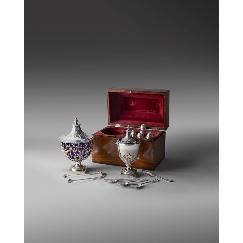 vase form, acanthus leaf decoration, the pull-off cover with an acorn finial, on a square base, engraved with a crest, the sugar basket and cover of circular form, wire-work body applied with foliate decoration, the pull-off cover with an acorn finial, initialled, later blue glass liner, on a square foot, the teaspoons with fluted bowls, the terminals with foliate scroll decoration on a matted background, the sprung sugar tongs with beaded decoration, in a fitted velvet lined wooden case, with a raised cover and alternate coloured stringing, silver handle and lock cover, height of sugar basket 20cm, length of case 24.8cm, approx. weight 31.9oz. (15)
