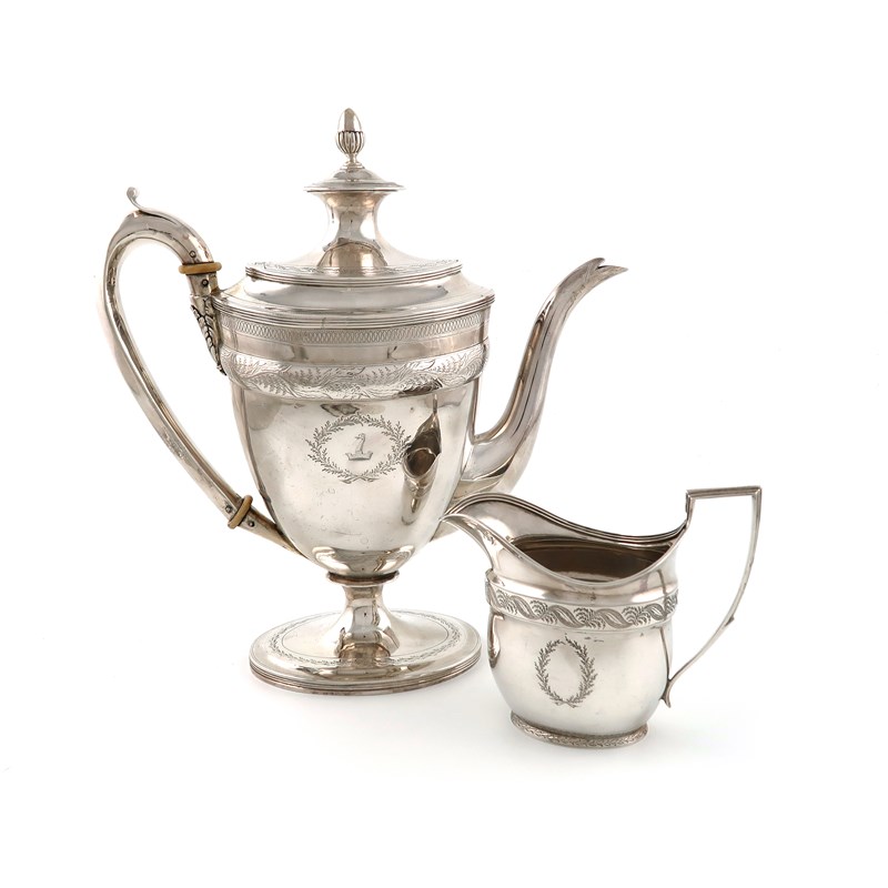 the coffee pot by John Emes, London 1801, the cream jug by the same maker, London 1800,
