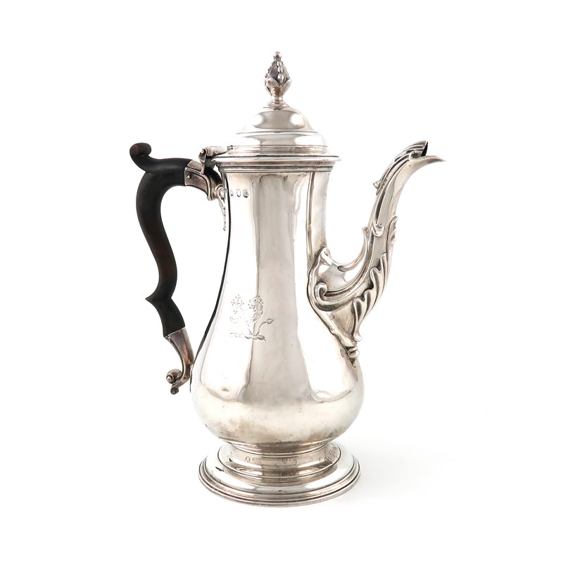 baluster form, scroll handle, domed hinged cover with a baluster finial, leaf capped spout, on a circular foot, engraved with a crest, height 28.5cm, approx. weight 28.4oz.