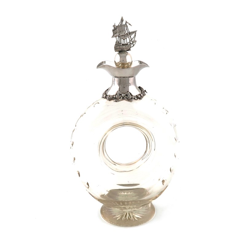 ring-shaped glass body, the mount with a ribbon-tied foliate border, the stopper mounted with a galleon, height 29.8cm.
