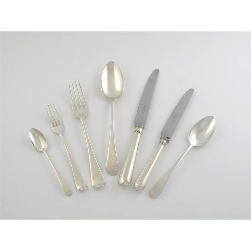 A George III matched canteen of Old English pattern flatware: twelve tablespoons, twelve tableforks, twelve dessert spoons, twelve dessert forks, and twelve teaspoons. Mixed makers, London 1796/1797, together with a set of 12 modern table knives and 12 side knives to match (stainless steel blades), 79oz weighable silver. (84)
