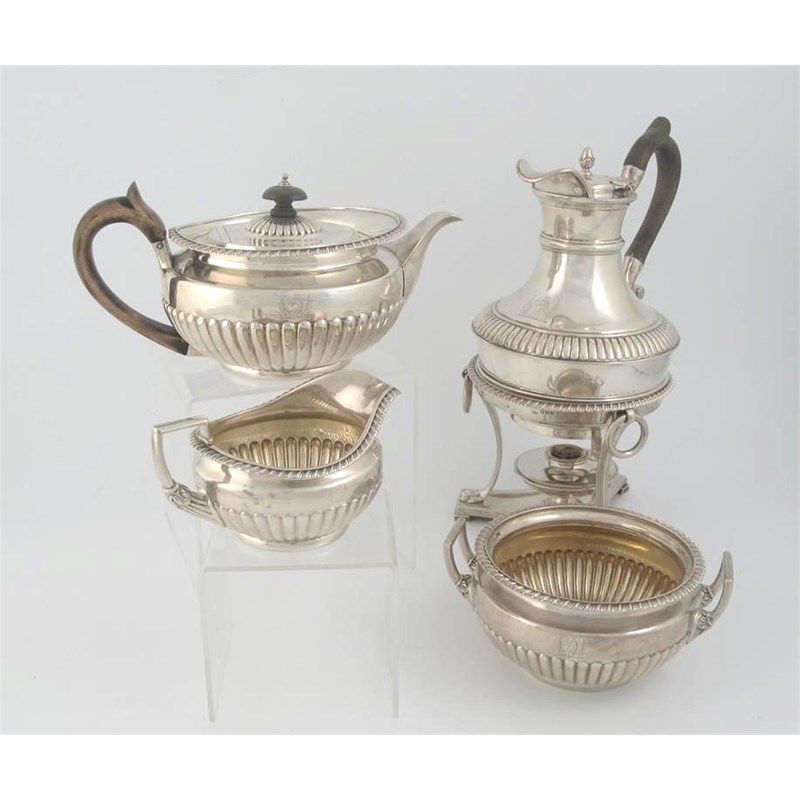 A George III four piece tea service, with part-fluted, circular bodies and gadrooned borders comprising: teapot, milk jug, sugar bowl and hot water jug on stand with burner, crested, by William Burwash & Richard Sibley, London 1812. 97oz. (4)