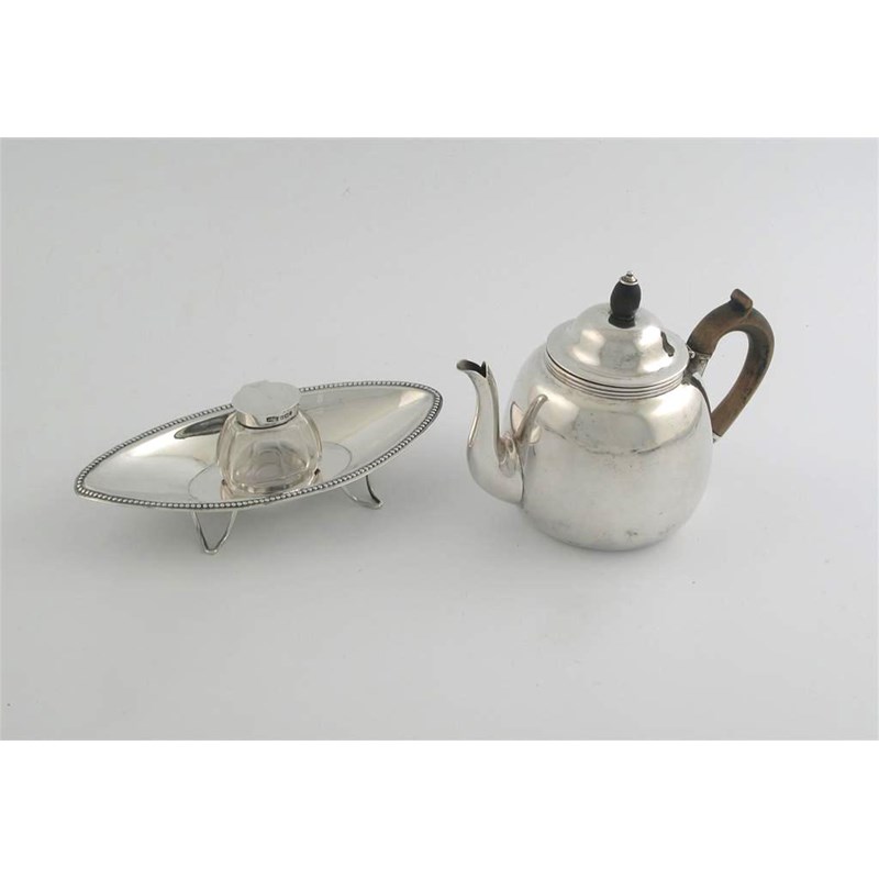 A Victorian bachelor's teapot, with a domed cover and knop finial, by George Fox, London 1872, and an Edwardian small navette shaped inkstand with a central mounted bottle, by James Dixon & Sons, Sheffield 1907, the latter 7.5in (19cm) long, 11.5oz weighable silver. (2)