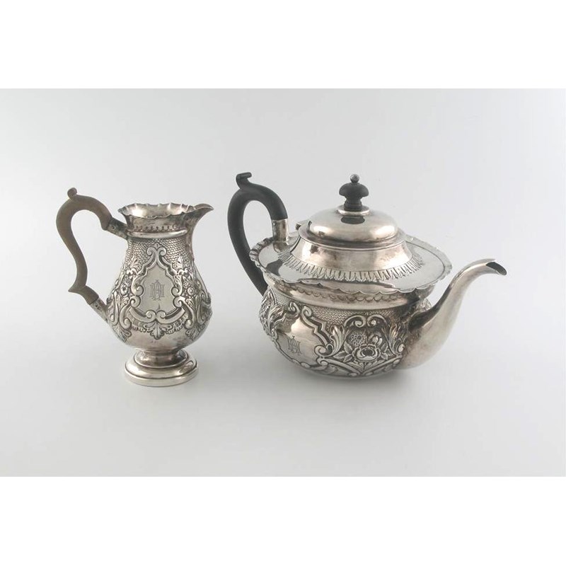 A late Victorian embossed baluster cream jug, London 1899, and a later matched teapot, London 1922, both by Josiah Williams & Co., 31oz weighable silver. (2)