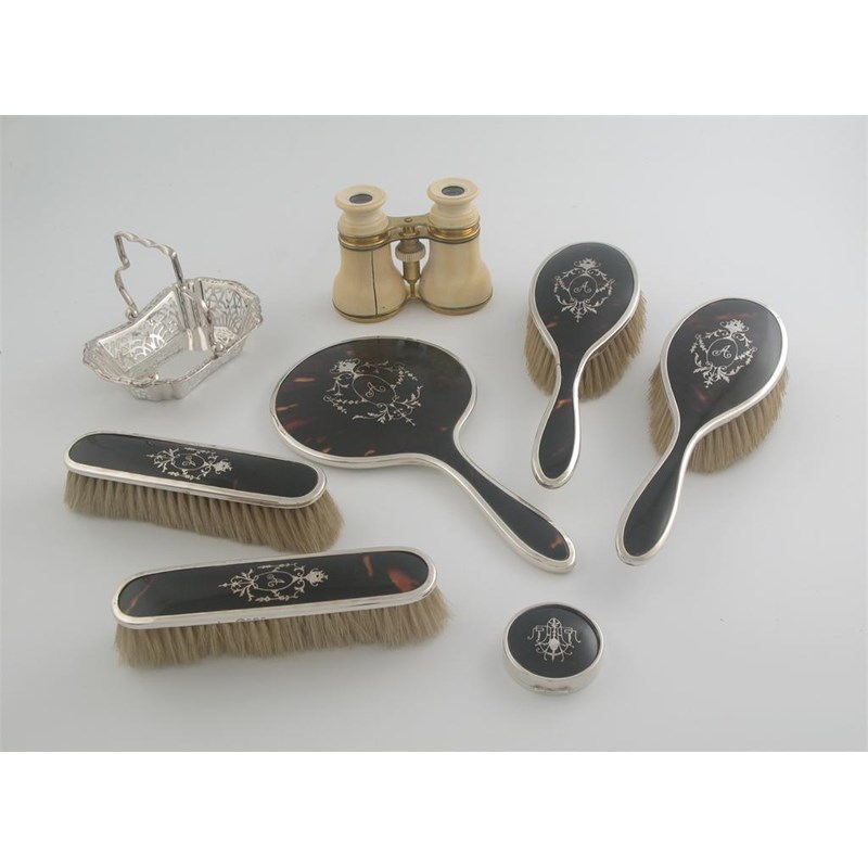 A mixed lot: a modern five piece mounted tortoiseshell dressing table set comprising hand mirror and four brushes with inlaid decoration and initialled 'A', by Adie Brothers, Birmingham 1924, together with a mounted and inlaid tortoiseshell pill box, a plated bon bon basket and a pair of gilt metal and ivory opera glasses. (8)
