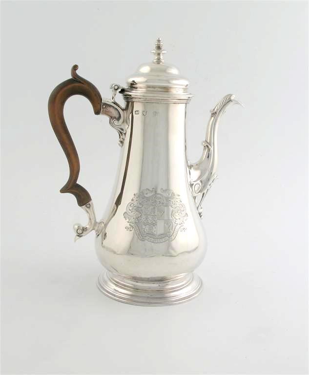 A George II baluster coffee pot, on a spreading circular foot with a decorative spout, and domed cover with knop finial, engraved coat of arms on one side and crest on the other, by R. Gurney & T. Cooke, London 1754, 10.25in (26cm) high. 28.5oz.