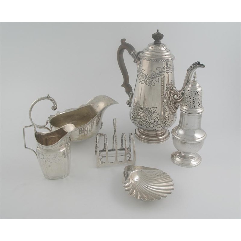 A mixed lot: a George III helmet cream jug, London 1815, the following modern silver: ten fish knives and forks, a pair of shell butter dishes, a baluster caster, small dish, a salver, Sheffield 1952, together with a quantity of plated ware: a muffin dish, pair of sauce boats, coffee pot, ice pail, tea strainer and coffee pot, 41oz weighable silver. (Lot)