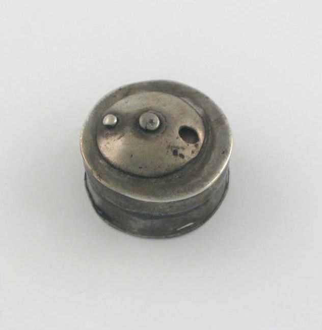 A late 17th/early 18th century circular smelling box, the pull off cover with a domed pivoting aperture for dispensing spice, initialled 'MH' on the base, maker's mark 'T.W', 0.75in (2cm) diameter.