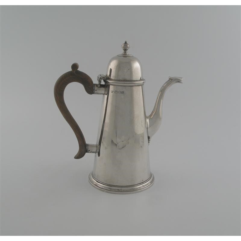 A modern coffee pot, tapering form, high domed cover, knop finial, maker's mark JLC, London 1967, 10.25in (26cm) high, 26oz weighable.