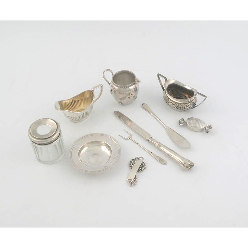 A mixed lot: A circular nut dish, mounted dressing table pot, a snuff box in the shape of a wrapped sweet, an identity bracelet, a pickle fork, a butter knife, a dessert knife, a small cream jug with fluted lower body, a continental cream jug with import marks for London 1904, mixed makers and dates, Edwardian to modern, and a plated small embossed sugar basin. (lot)