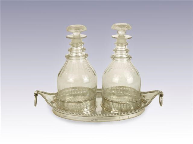 A George III boat-shaped decanter stand, with gadrooned borders, drop ring handles and two pierced receivers, engraved twice with an armorial, incised scratchweight '30-7' and fitted with two glass decanters with mushroom stoppers, the base by Michael Plummer, London 1794 (inset wooden base), 15.25in (38.5cm) long.