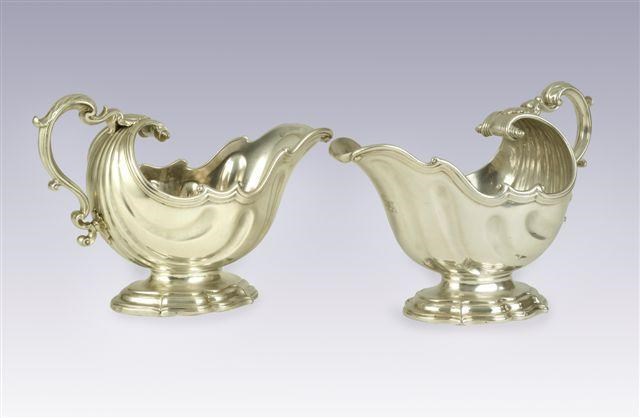 A pair of George II sauce boats, on shaped oval bases with fluted bodies, applied scroll rims and a leaf-capped, double scroll handle, crested, by James Shruder, London 1748, 8.5in (21.6cm) long, 39oz. (2)