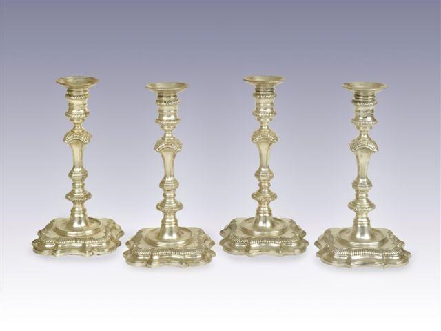 A set of four George II cast candlesticks on shaped square bases with 'well' centres and knopped...
