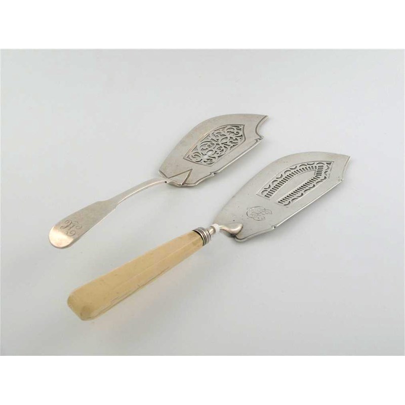 A George III fish slice, pierced blade, initialled 'CE', turned ivory handle, by Eley & Fearn, London 1810, and a Victorian fish slice, pierced blade initialled 'JC', maker's mark JB, London 1837, 4.5oz weighable silver. (2)