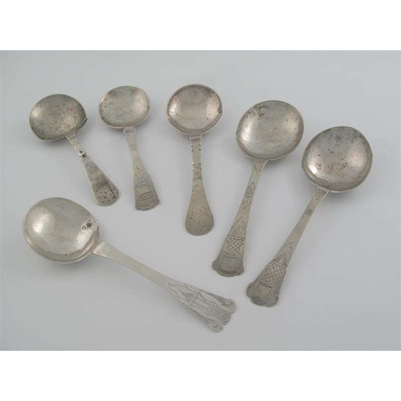 Six various 18th century Norwegian spoons, with engraved stems, four marked and two unmarked, 5oz. (6)