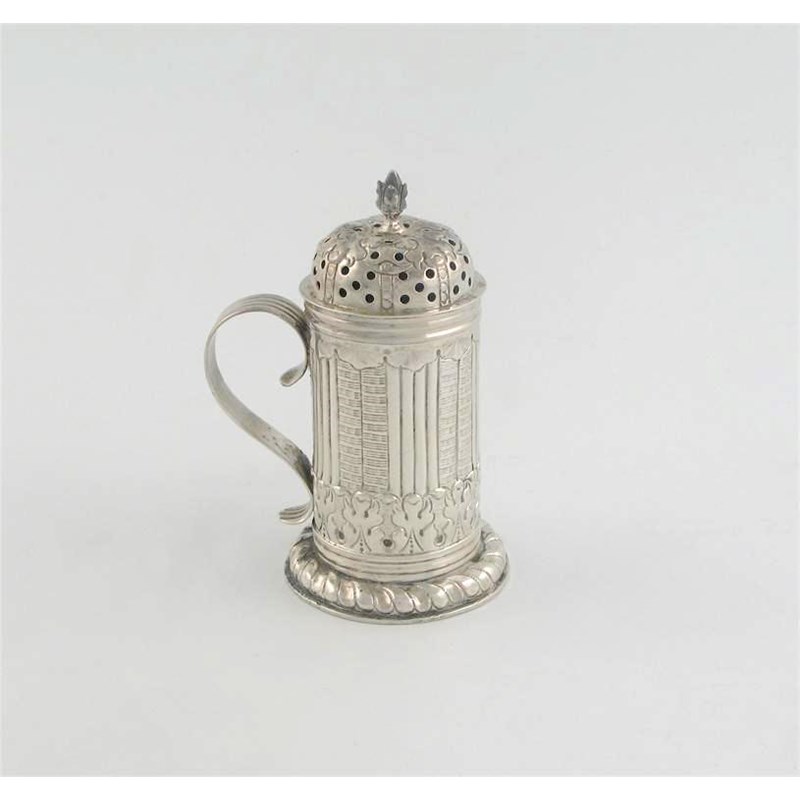 An 18th century Dutch, kitchen dredger, on a domed foot with embossed decoration, a domed cover and a bud finial, unascribed, probably early 18th century, 4.75in (12cm) high, 3.5oz.