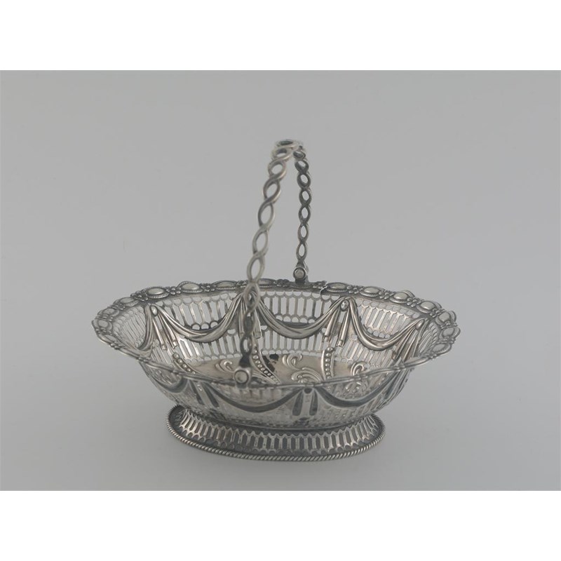 A Victorian oval sweetmeat basket, with fret work body embossed with swags, swing handle, by William Plummer, London 1774, 6in (5.3cm) long, 3.8oz.