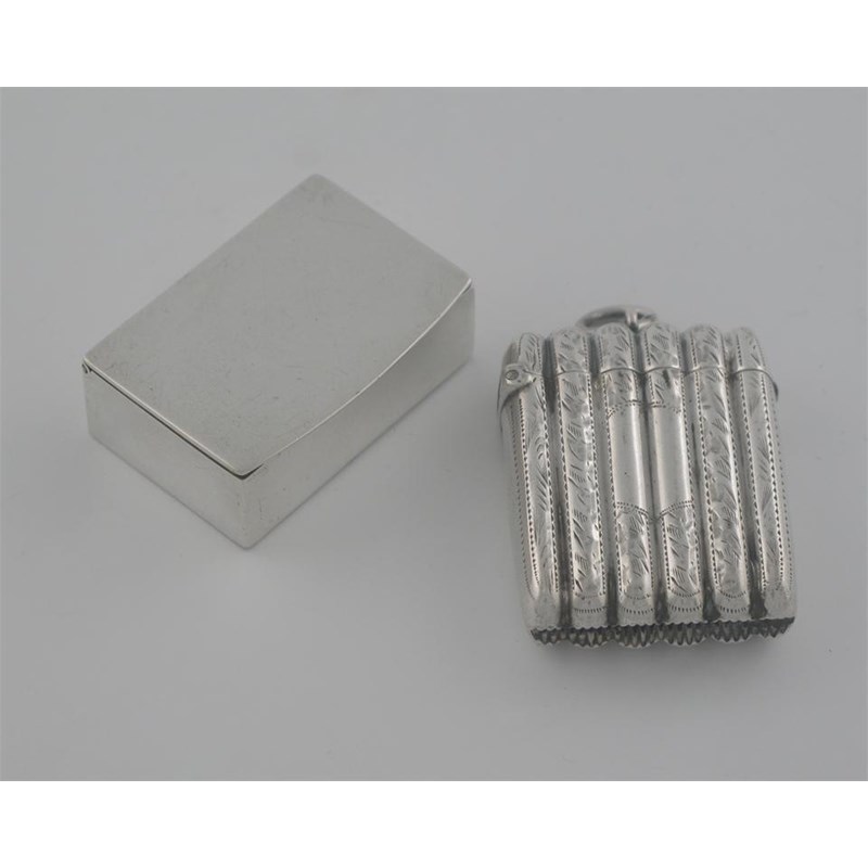 A late Victorian vesta case, with engraved and lobed decoration, maker 'M&L', Birmingham 1900, and a plain vesta box with inset metal striker on the interior, by W. F. Wright, London 1911, 2.25oz. (2)