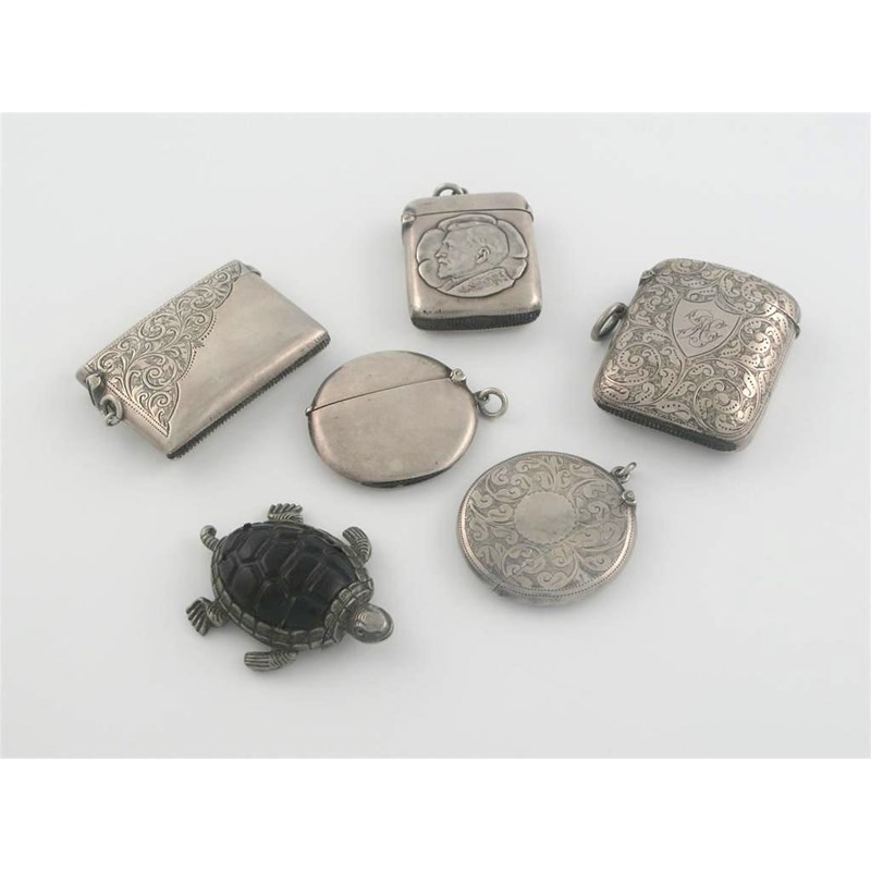 A Victorian rounded oblong vesta case, engraved all over with foliate decoration, shield shaped cartouche, monogrammed, maker's mark over striking another, Birmingham 1894, four Edwardian vestas including a portrait vesta, mixed makers and dates, and a plated tortoise example, 4oz weighable silver. (6)