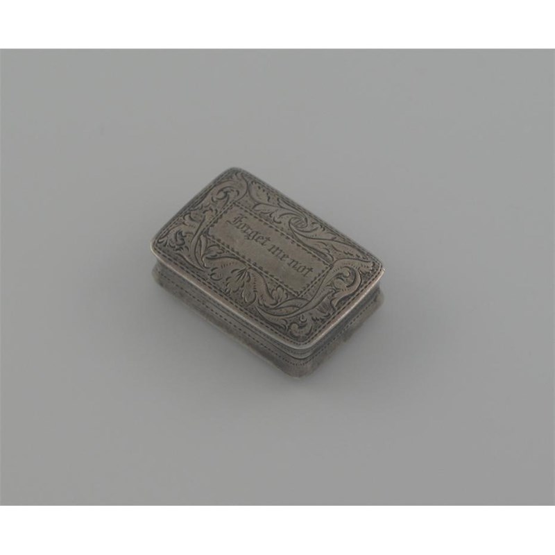 A William IV oblong vinaigrette, engraved decoration and inscribed 'Forget Me Not', pierced grill, by Nathaniel Mills, Birmingham 1830, 1.25in (3.2cm) long.