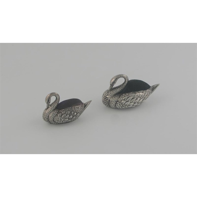 Two Edwardian novelty pincushions, one large, one small, in the form of a swimming swan, by Adie & Lovekin, Birmingham 1907, the largest 2.75in (7cm) long.