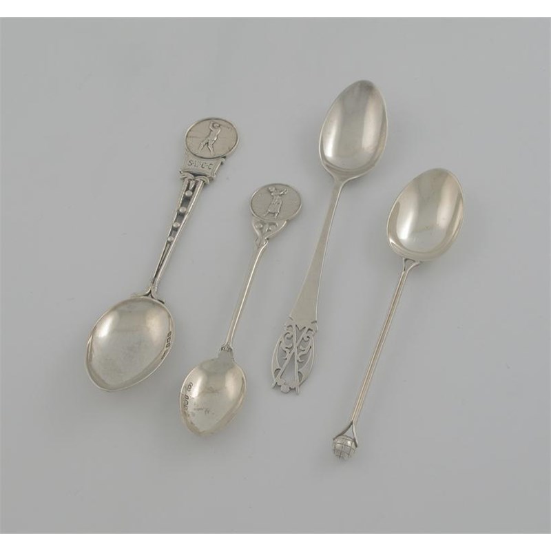 Golfing interest: Four modern teaspoons, each with a golf related terminal, one a presentation spoon for Salisbury & Wiltshire Golf Club, mixed makers and dates, 1.5oz. (4)