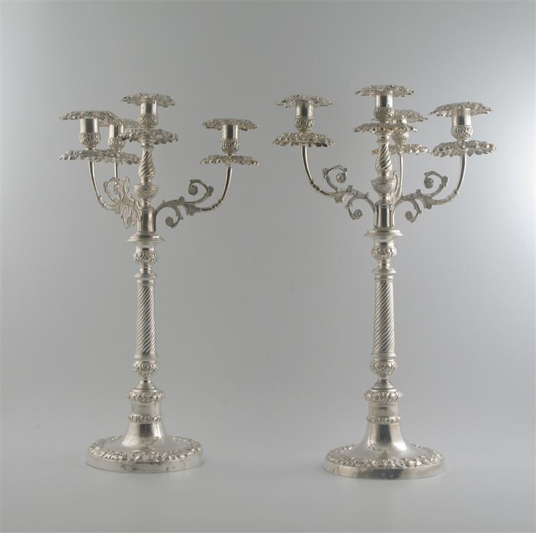 A pair of mid 19th century Italian four light candelabra, on raised circular base with embossed border, knoped stem and spiral fluted central section, three scrolling branches, foliate drip trays, by Fillipo Pansi, c.1840, 18.25in (46.3cm) high, 11in (28cm) span, 70oz. (2)