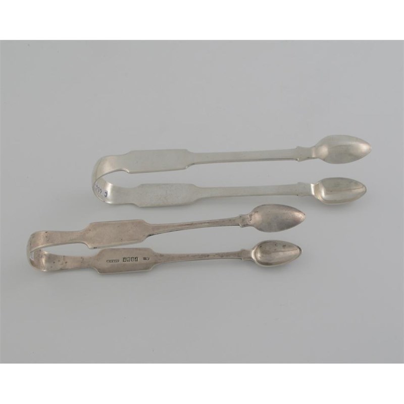Two pairs of Irish sugar tongs, shaped Fiddle pattern; one initialled by W. Cummins, Dublin 1830, the other pair also initialled, by Richard Whitford, Dublin 1811 (retailer's mark of West), 3.25oz. (2)