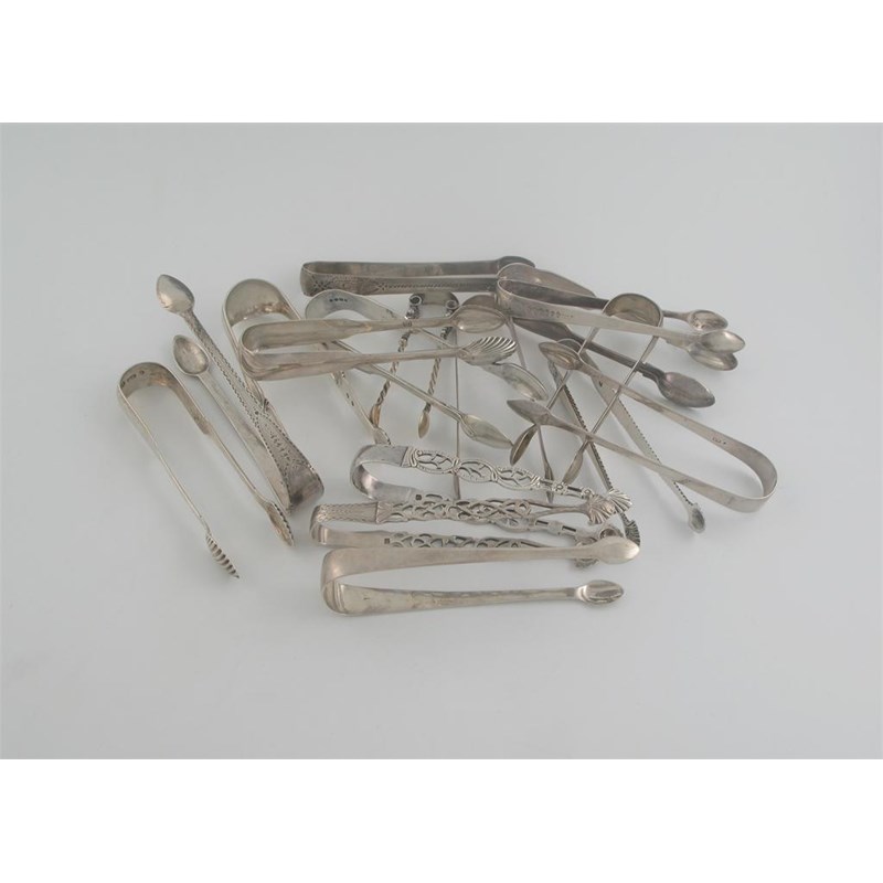 Sixteen pairs of sugar tongs, including three George III/IV Edinburgh made pairs, and various others, mixed makers and dates, George III - Victorian, 21.1oz. (16)