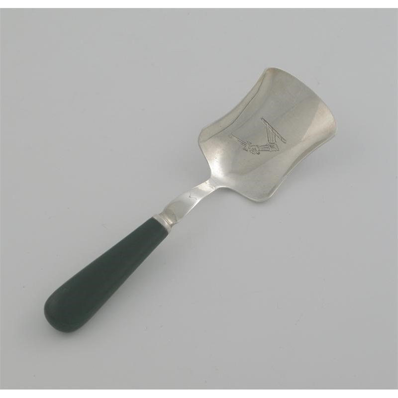 A George III caddy shovel, with a green-stained ivory handle, crested bowl, by Samuel Davenport, London 1791.