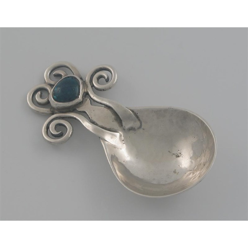 By Ramsden and Carr: an Edwardian caddy spoon, with fig shaped bowl, hammered finish, openwork stem, inset oval enamel cabochon, London 1907, 3.3in (8.5cm) long, 1.2oz.