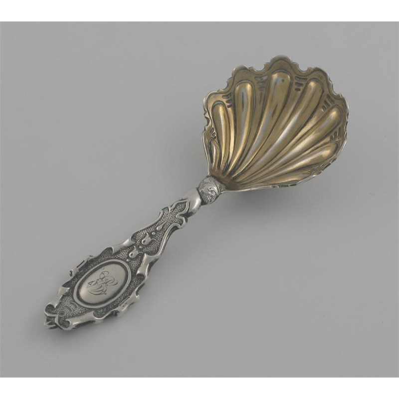 A Victorian caddy spoon, with shell gilt bowl, shaped scrolling stem, oval cartouche, monogrammed, by Francis Higgins, London 1855, 4.25in (10.5cm) long.