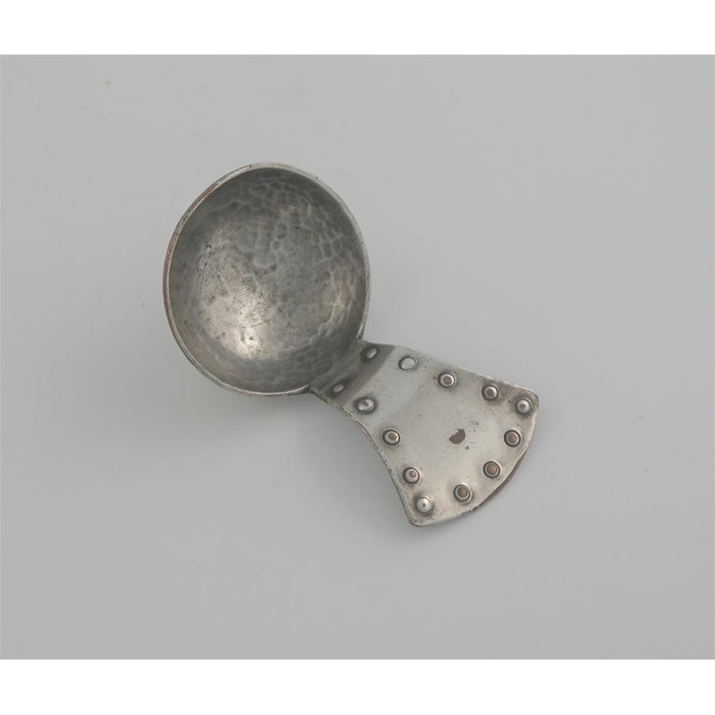 An arts and crafts plated copper caddy spoon, with hammered and beaded decoration, by the Keswick School of Industries and Art.