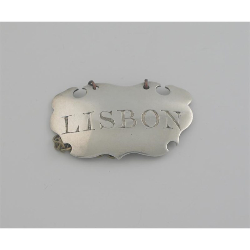 A George II escutcheon wine label, incised 'LISBON', unmarked c.1750.