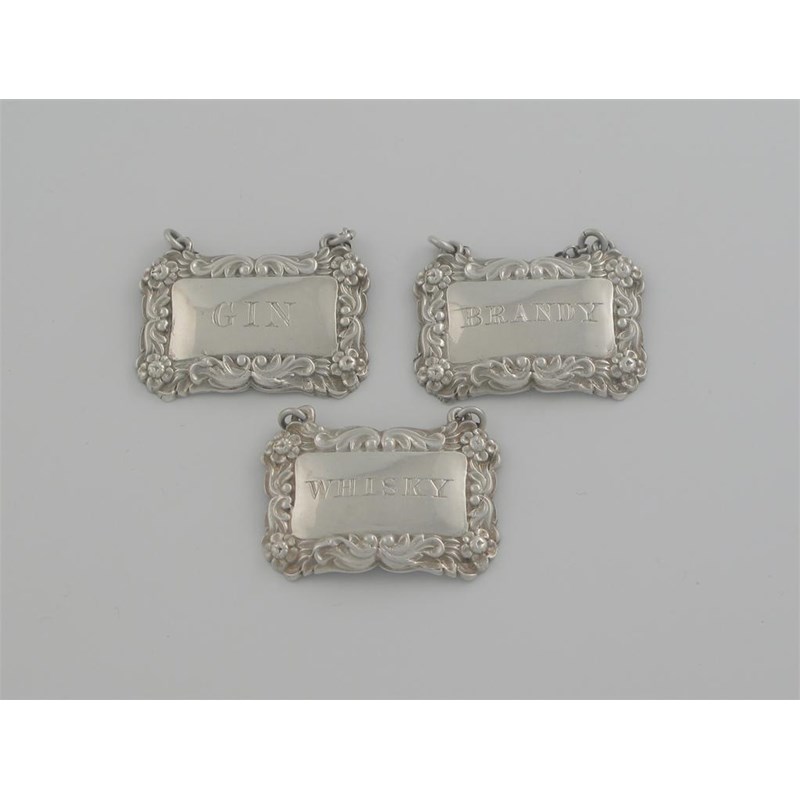 A marked set of three Victorian Scottish wine labels, with stamped floral scroll borders incised, 'WHISKY', 'GIN' and 'BRANDY', by William Marshall of Edinburgh c.1870. (3)