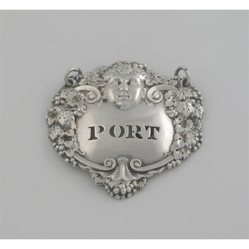 A George III Bacchanalian wine label, decorated with a mask, scrolls and fruiting vines, pierced 'PORT' by C. Rawlings, London 1818.