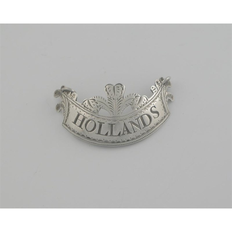 A George III bright-cut wine label, curved and surmounted by the Prince of Wales's feathers, incised 'HOLLANDS', by Peter & Ann Bateman, London 1792.