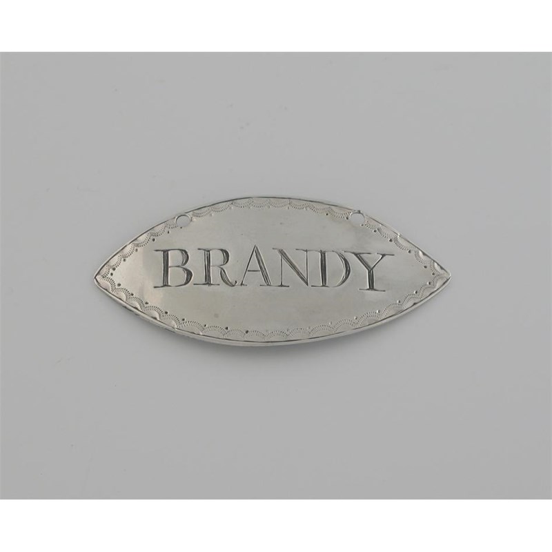 A George III navette shaped label, with a bright-cut border, incised 'BRANDY', by John Lambe, London c.1790.