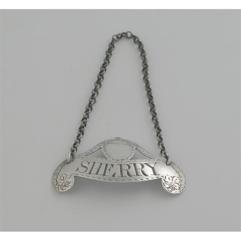 A George III curved wine label, with a pierced oval surmount and engraved festoon borders, incised 'SHERRY', by T. Phipps & E. Robinson, London c.1790.