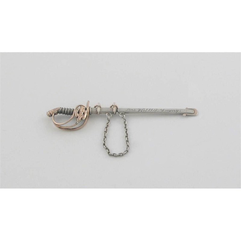 A novelty continental parcel-gilt stick pin, in the form of a sword and scabbard, steel pin, inscription for 1903, unmarked, 2.7in (7cm) long.