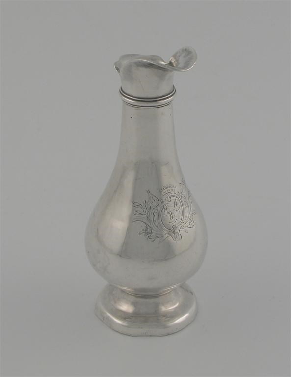 A small baluster ewer, engraved coat of arms, initialled V, unmarked except an incuse 'S' on the foot, 5.25in (13.4cm) tall, 3.3oz.